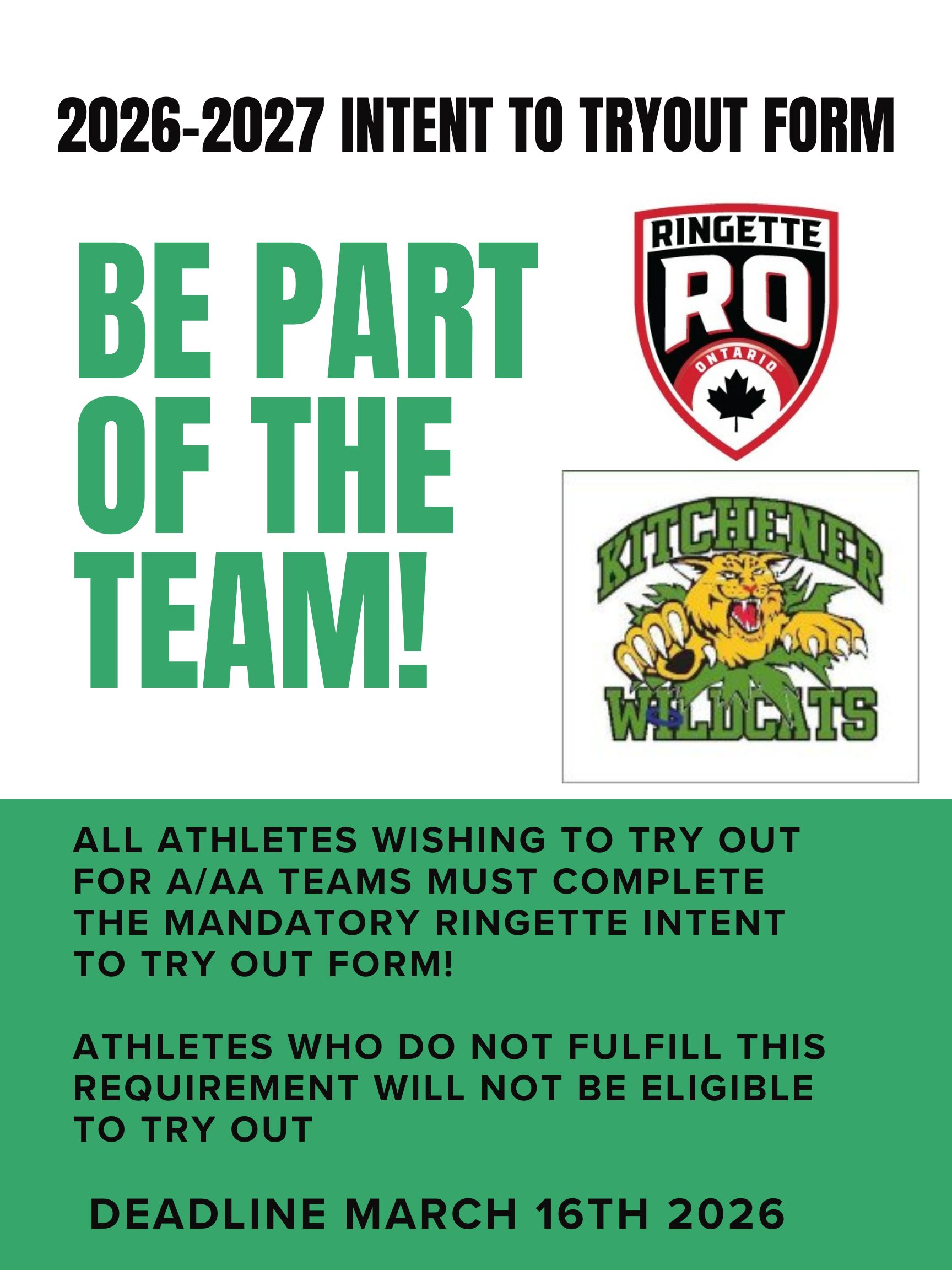 All athletes planning to try out must complete the MANDATORY Tryout Intent Form through Ringette Ontario by March 16th. The link to the form can be found on the Ringette Ontario page